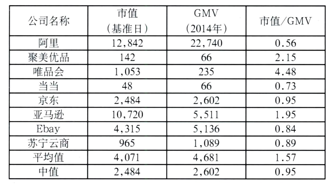 比如:對電商就可以分析GMV(Gross Merchandise Volume)指標。我們在某個(gè)案例中研究了2014年末的上市電商企業(yè),發(fā)現基準日市值和GMV指標存在相關(guān)關(guān)系,分析之后可用于電商平臺類(lèi)的互聯(lián)網(wǎng)企業(yè)的估值比較。市值和GMV關(guān)系如表1。